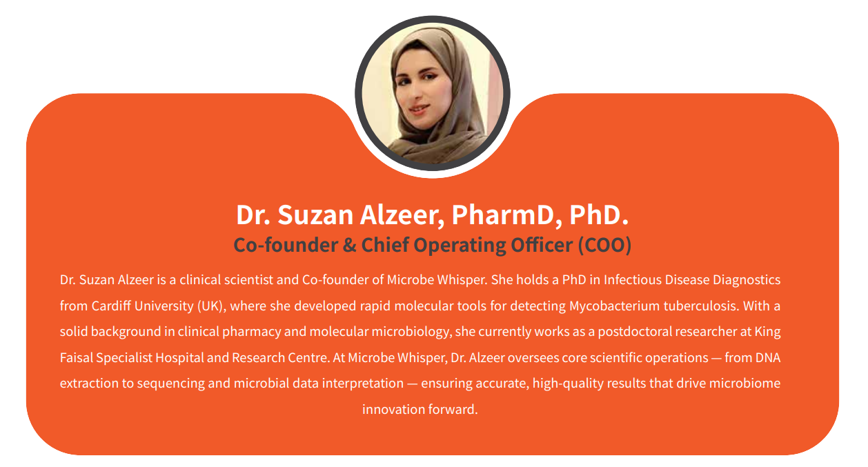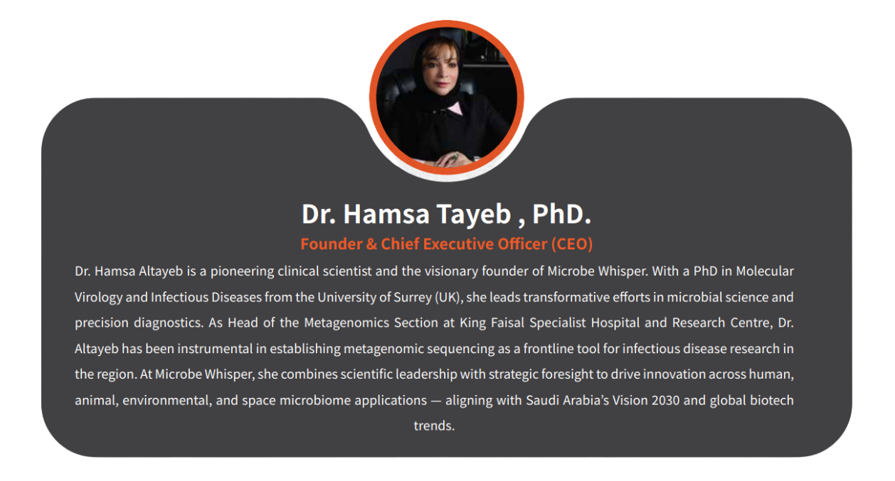 Dr. Hamsa Altayeb is a pioneering clinical scientist and the visionary founder of Microbe Whisper. With a PhD in Molecular Virology and Infectious Diseases from the University of Surrey (UK), she leads transformative efforts in microbial science and precision diagnostics. As Head of the Metagenomics Section at King Faisal Specialist Hospital and Research Centre, Dr. Altayeb has been instrumental in establishing metagenomic sequencing as a frontline tool for infectious disease research in the region. At Microbe Whisper, she combines scientific leadership with strategic foresight to drive innovation across human, animal, environmental, and space microbiome applications – aligning with Saudi Arabia’s Vision 2030 and global biotech trends.